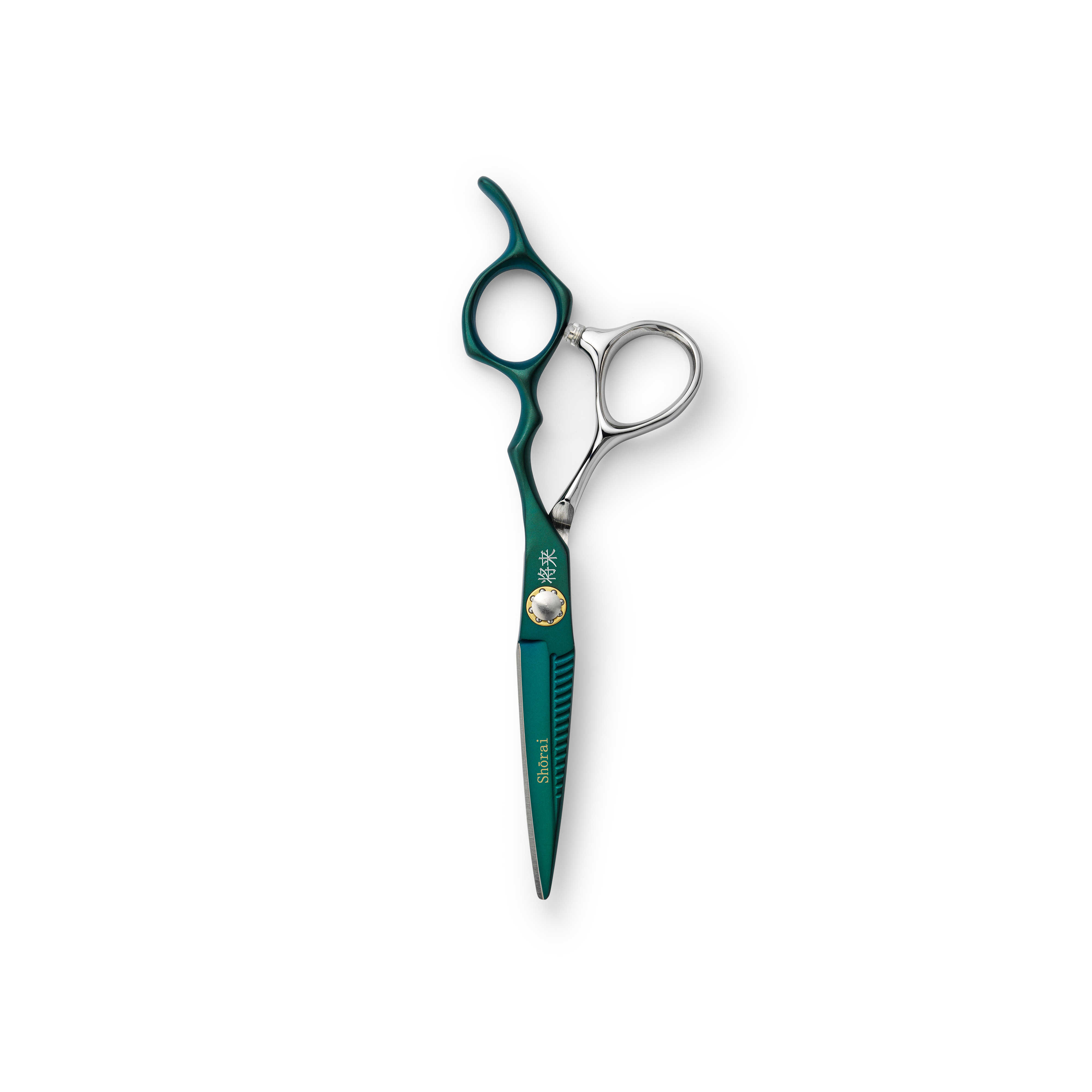 Series Shōrai FC Size (inch) 5,5" Design of handle Offset Handle Finger Rest Permanent Finger Hole Regular Material Stainless Steel 440c Blade Shark Head Shaped Blade Screw Ball Bearing Screw Included accessories Bamboo box, finger rings, scissor key, scissor oil and cleaning cloth -