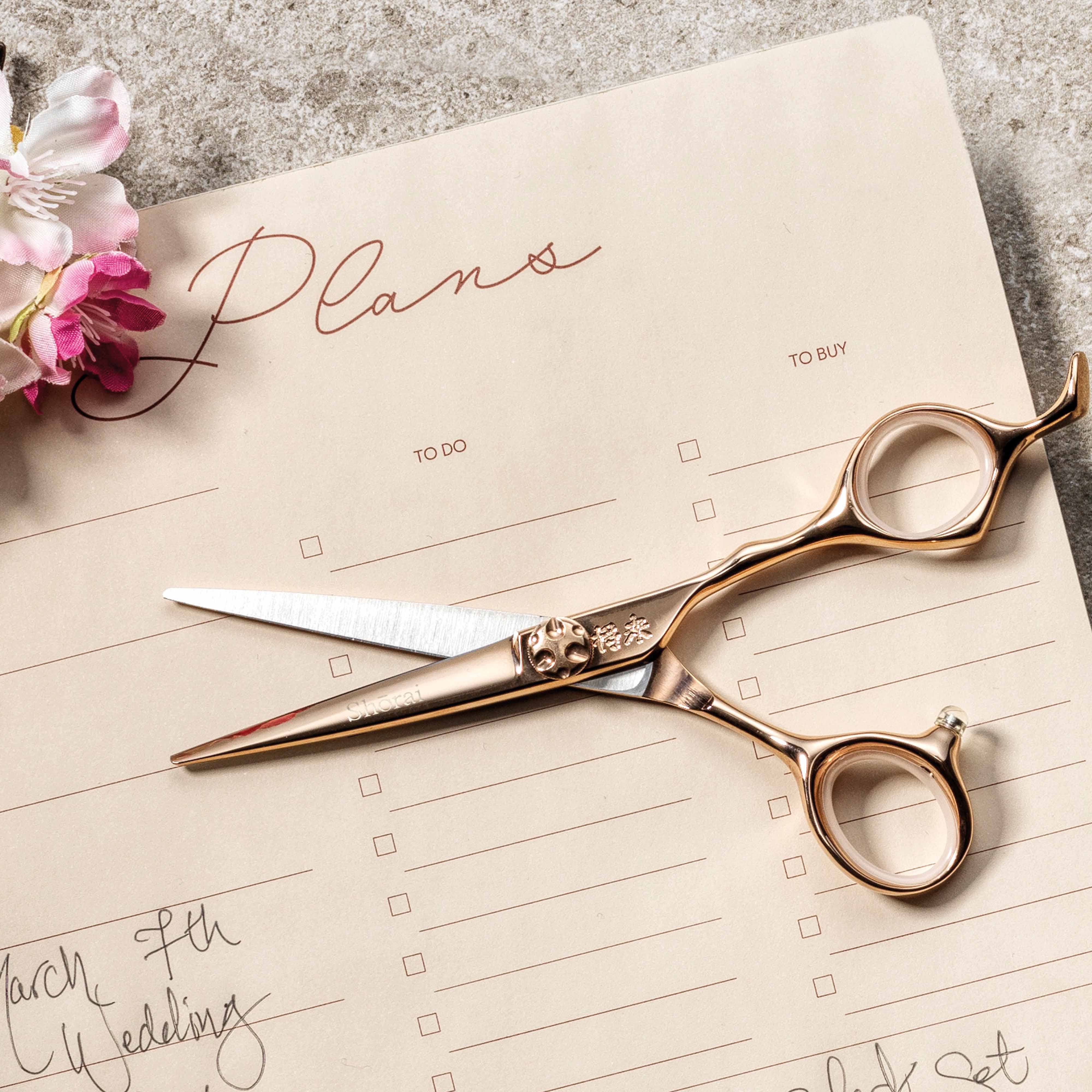 Series Shōrai SC Size (inch) 6" Design of handle Offset Handle Finger Rest Permanent Finger Hole Regular Material Stainless Steel Japanese 440c, Rosé Gold Coating Blade Standard Blade Screw Adjustable Screw Included accessories Adjustment key, Scissor Oil & Cleaning Cloth - Files