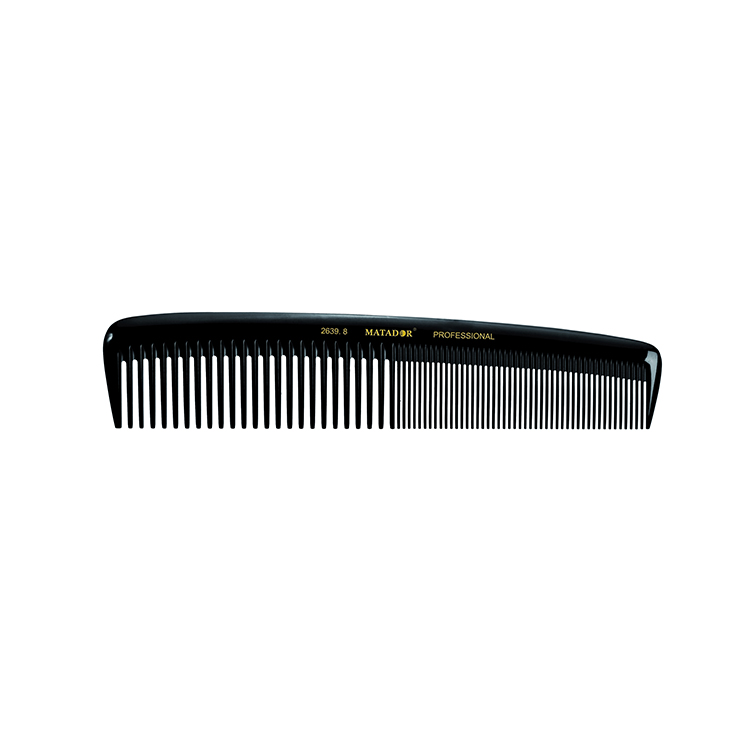 A high-end line of combs from New-York Hamburger, one of the world leading comb manufacturers. They are made from vulcanized natural rubber (ebonite) and go through a staggering 24 steps in production from a solid block of rubber to a finished comb. Matador combs with their cone-shaped, finely polished and rounded pins glide softly through the hair, no tangling or knotting, no damage to hair. Like in the past, the comb pins are formed in an elaborative, largely manual process through sawing with diamond cutters. The material is also very resistant to heat, discoloration and acids.