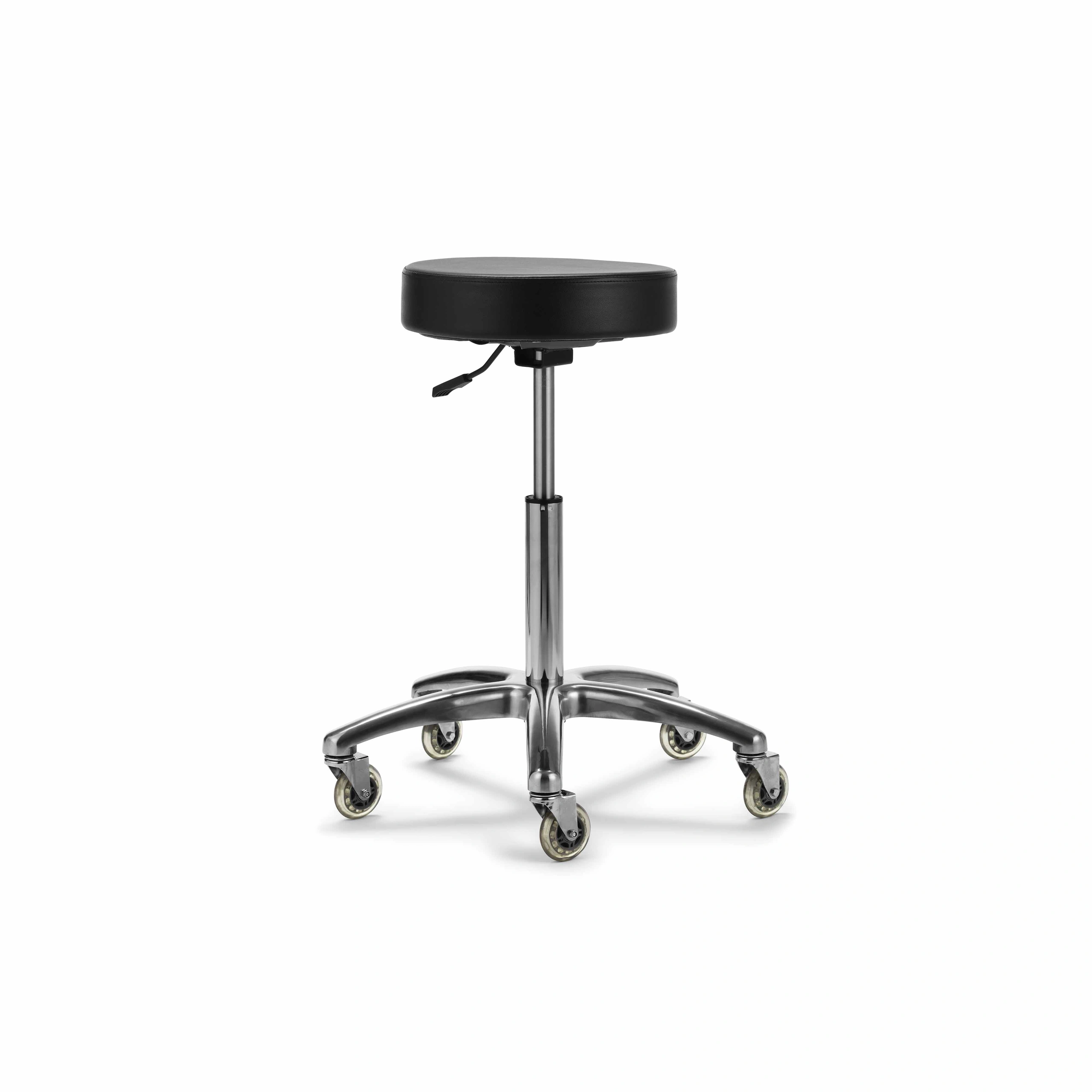 Adjustable salon stool with gaslift, rubber wheels and sitting height from 57-77cm.