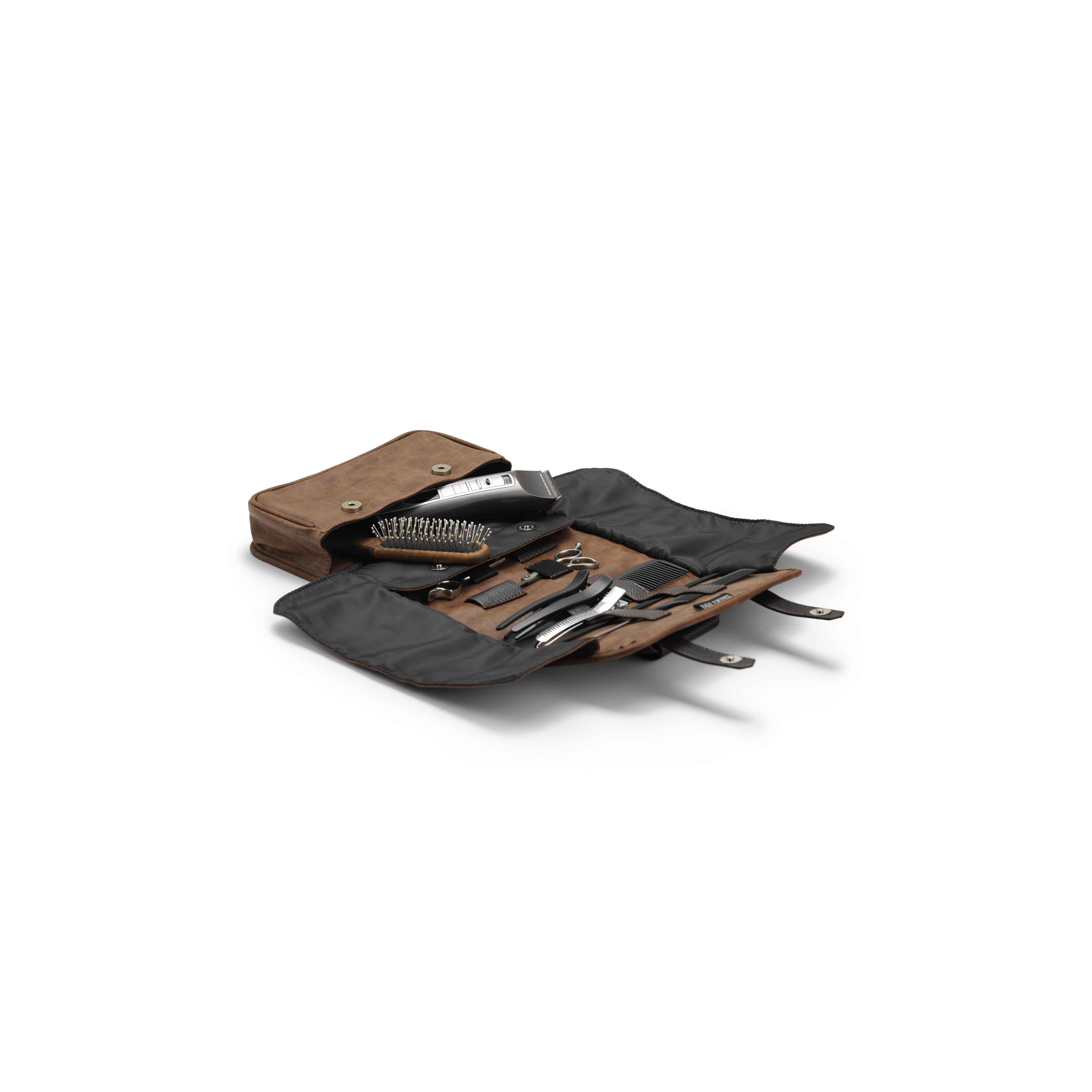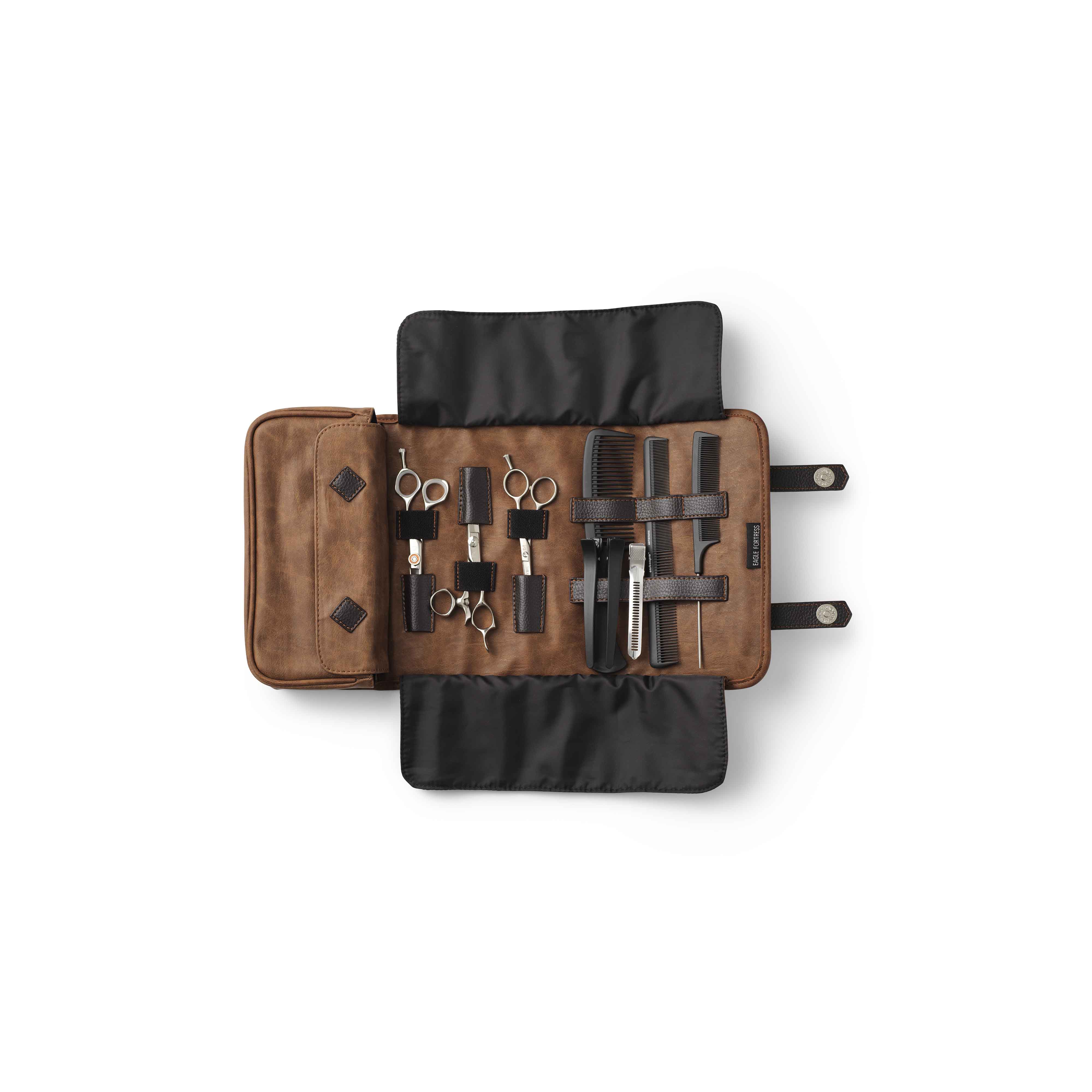 A functional styling case made of soft PU leather. The case has room for a variety of hair tools. It has elastic bands for three scissors and holders for both combs and hair clips. Available in brown and vintage black.