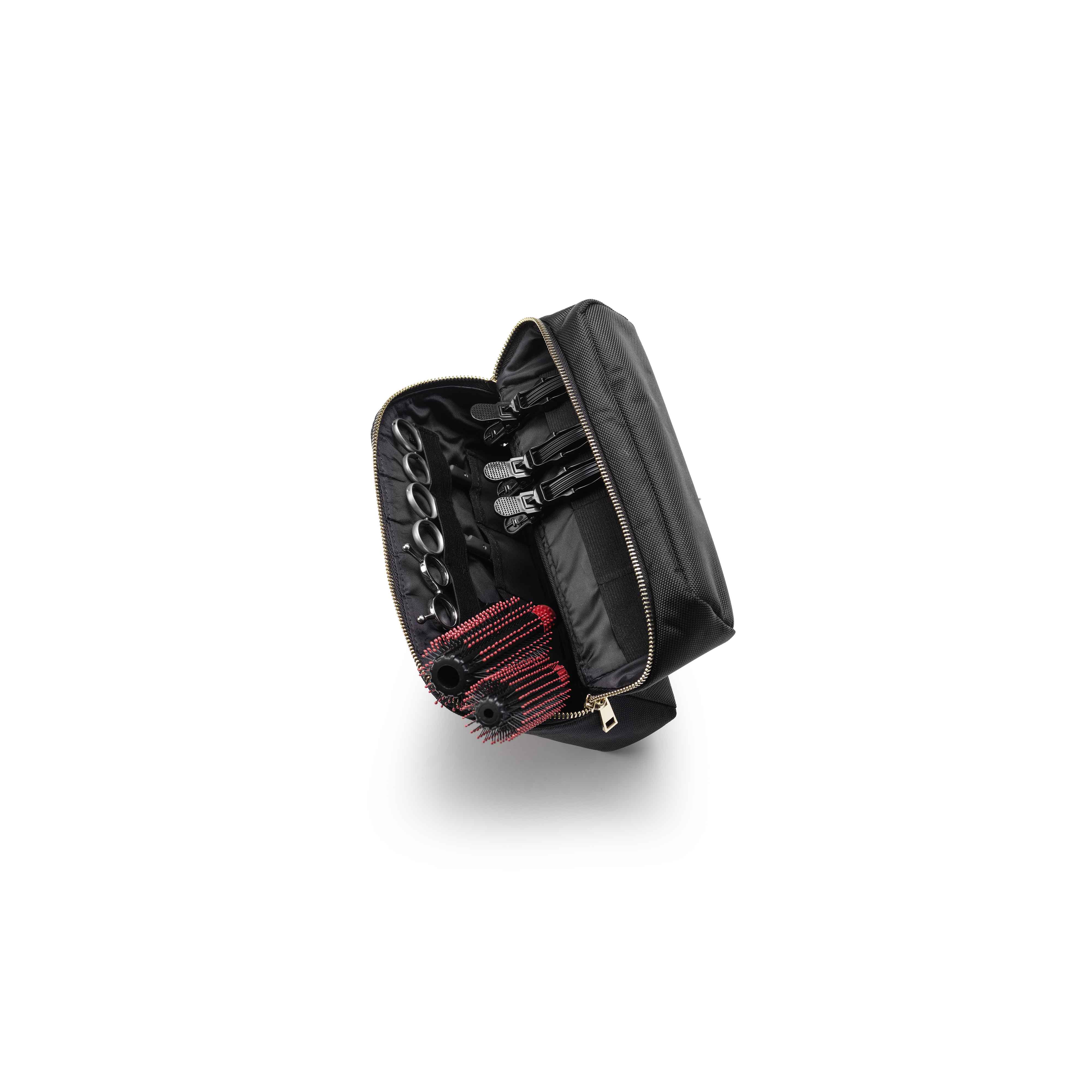 Make your work easier everyday with its mini size but large internal storage. A simple, multifunctional tool case. It has four elastic bands that can hold scissors, brushes or combs. Elastic strips that keeps clips in place while using them.