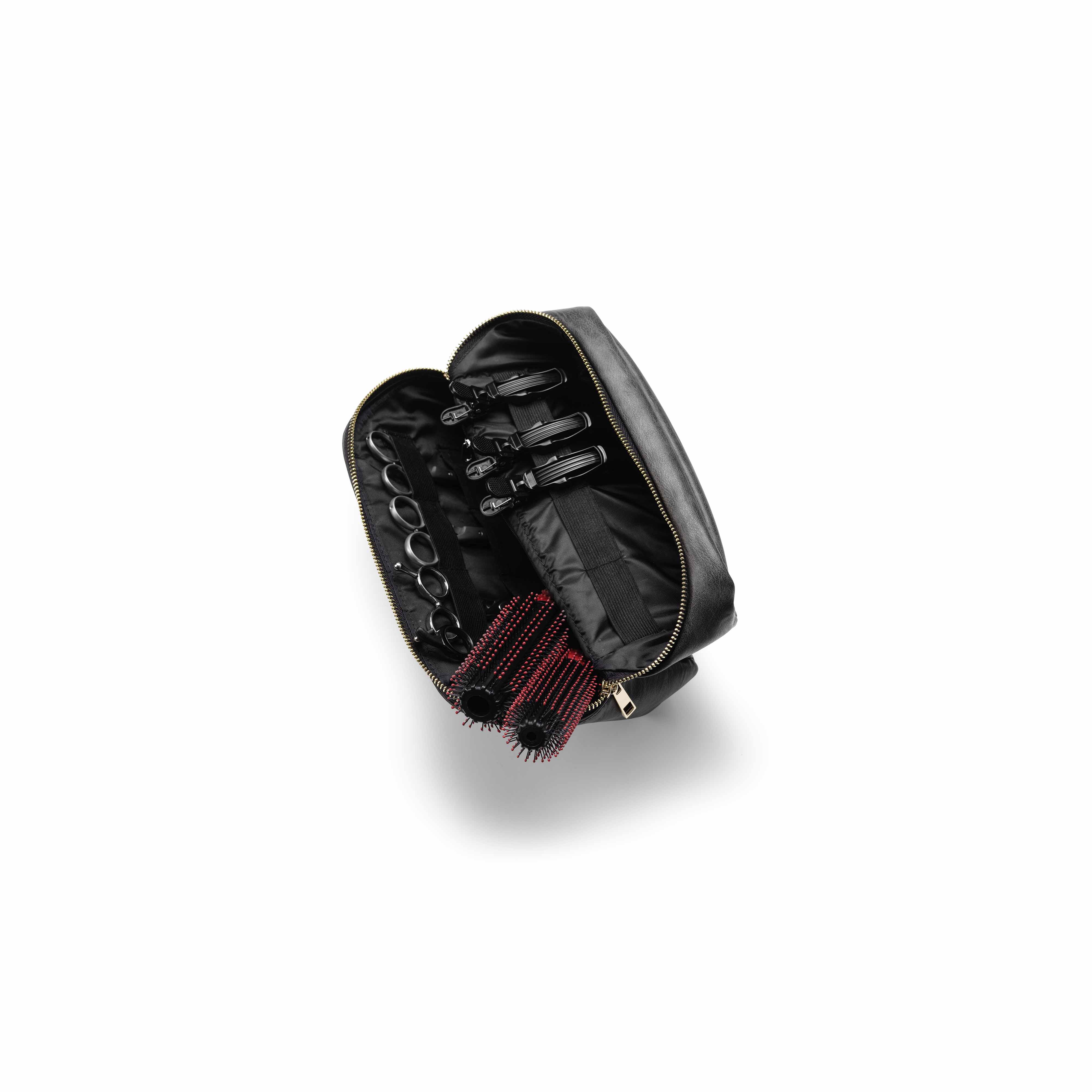 Make your work easier everyday with its mini size but large internal storage. A simple, multifunctional tool case. It has four elastic bands that can hold scissors, brushes or combs. Elastic strips that keeps clips in place while using them.